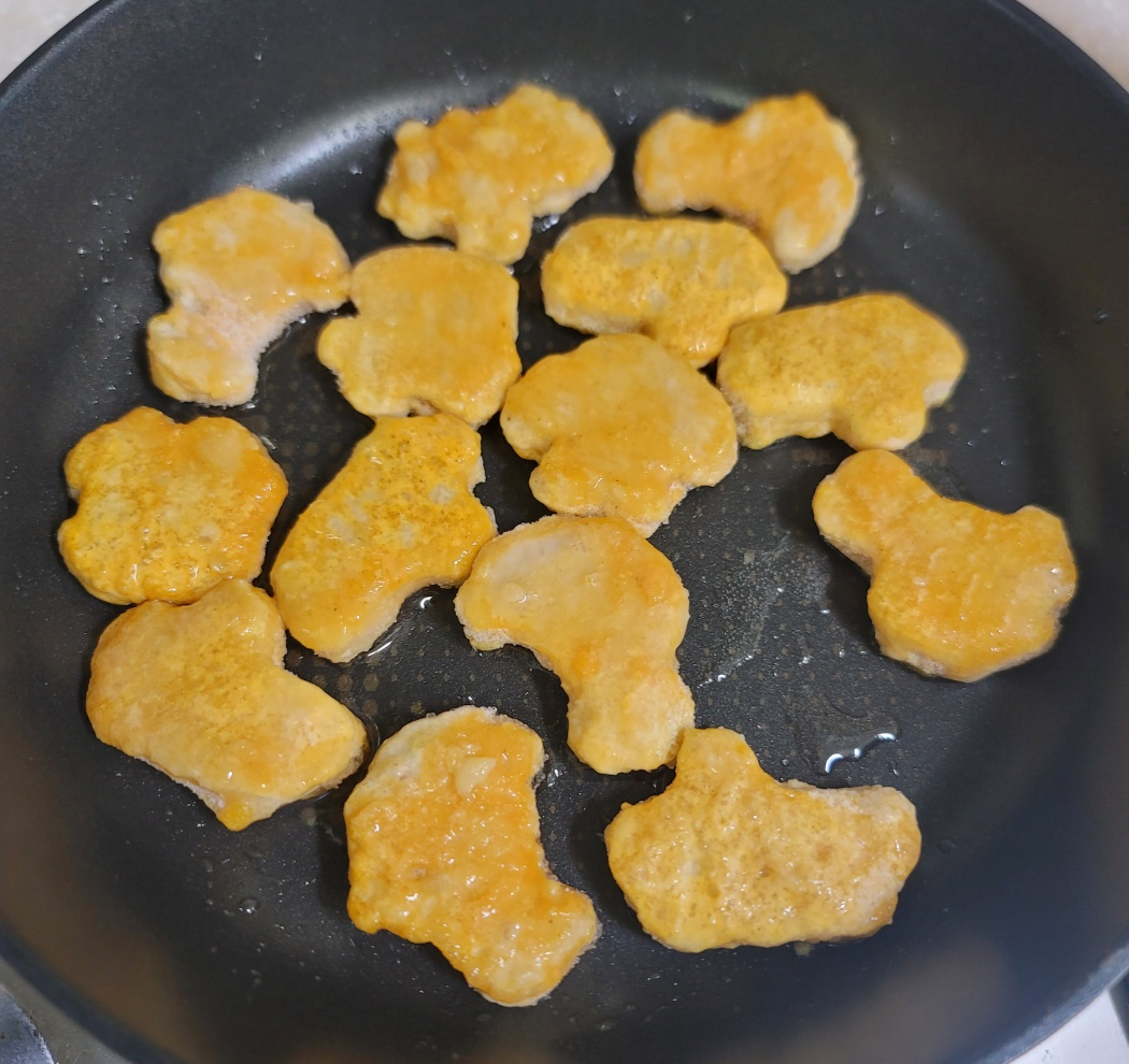 프라이팬에 기름을 넉넉하게 붓고 얼어있던 치킨너겟을 넣어 구워줍니다. 냉동 치킨너겟이라 구울 때 시간이 걸리는데 이 시간을 활용해 허니콤보 양념을 만들어줍니다.
