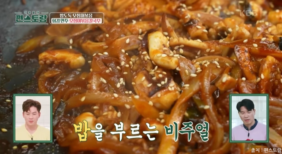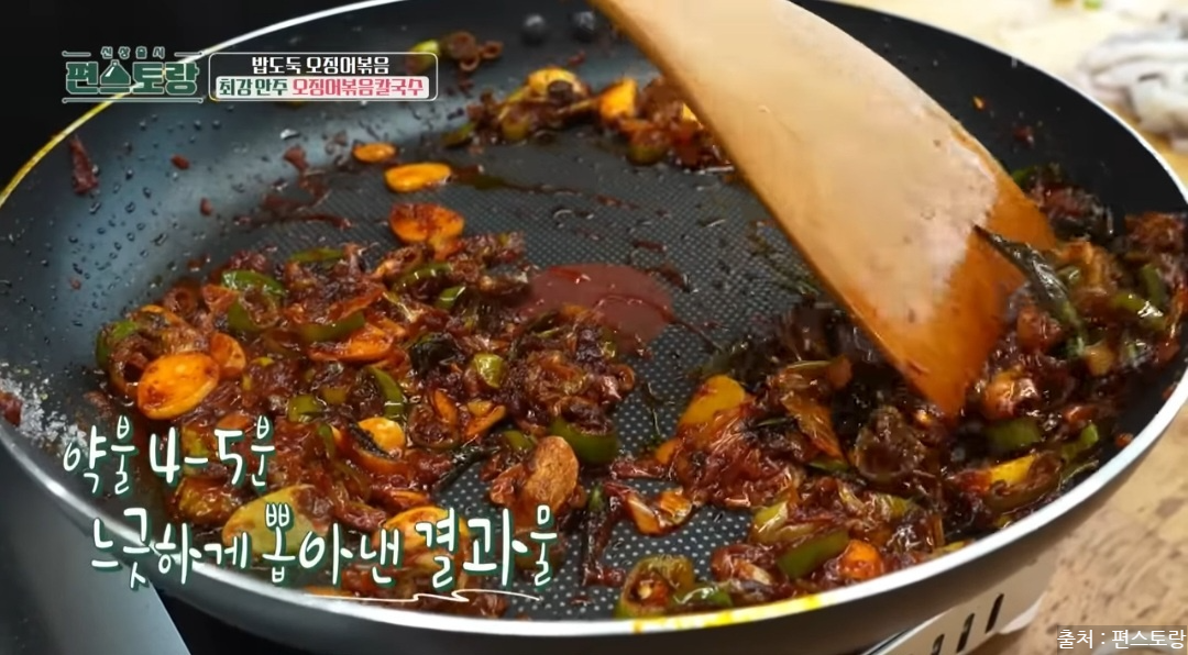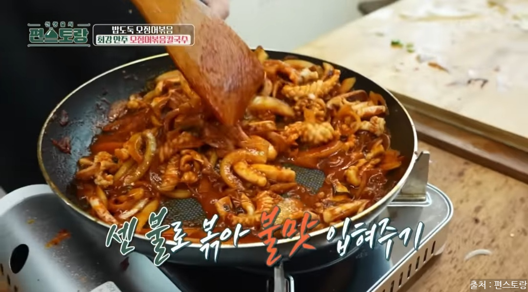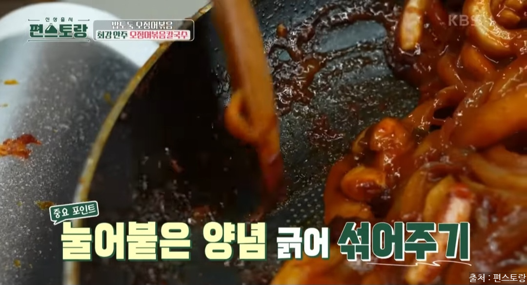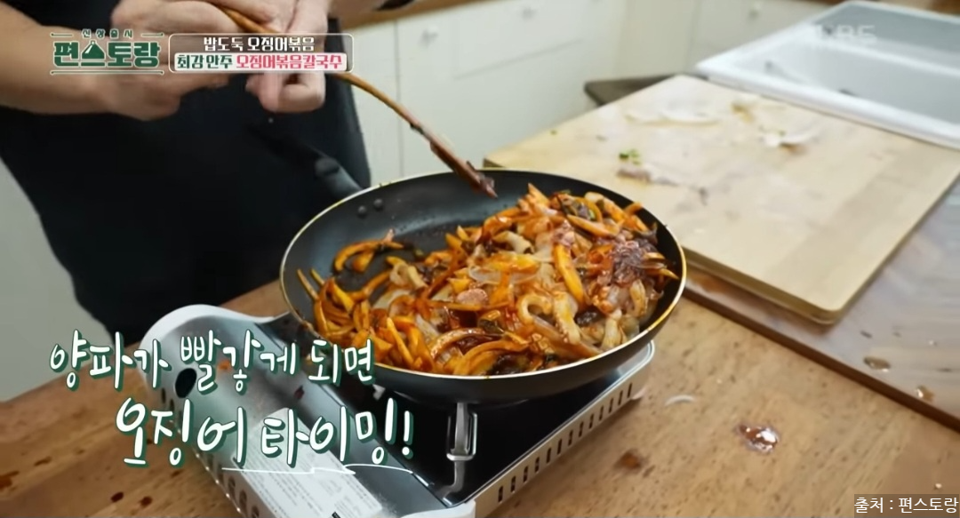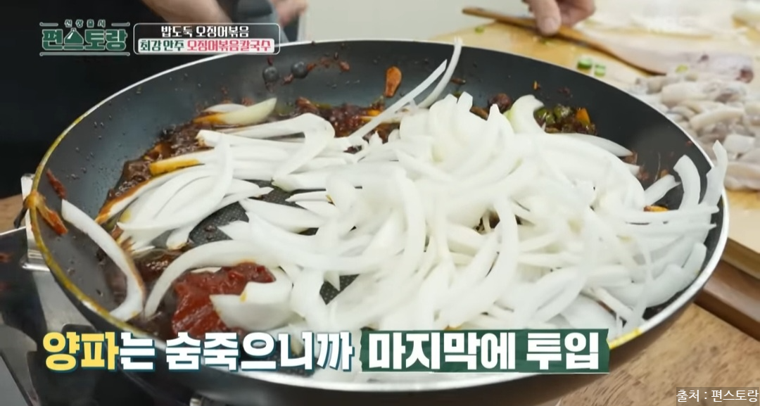 양파가 빨갛게 되면 마지막에 오징어를 넣어줍니다. 말캉하고 촉촉한 식감을 위해 오징어를 마지막에 넣어줍니다.