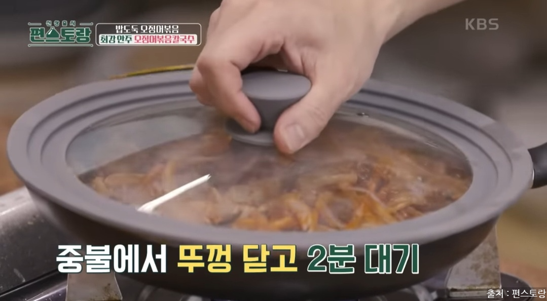 중불에서 뚜껑 닫고 2분간 쪄줍니다. 2분 후 오징어 볶음에 물이 엄청 나옵니다.