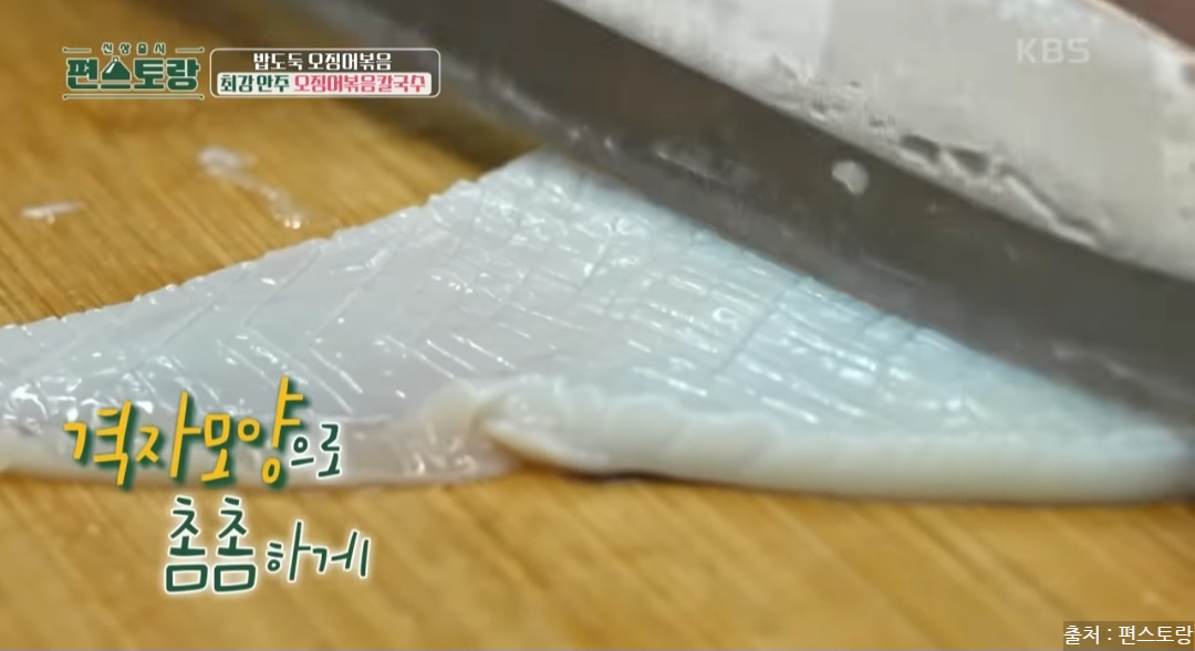 오징어 껍질을 떼도 되지만 껍질에는 타우린이 풍부하니 떼지 말고 요리해 주세요. 뒤집어서 하얀 살에 칼집을 내주세요. 칼질하기 쉽게 반 갈라주고 칼이 살짝 지나가는 것처럼 격자모양으로 촘촘하게 칼집을 내주세요. 격자모양의 칼집으로 식감도 올라가고 양념도 잘 배어듭니다.