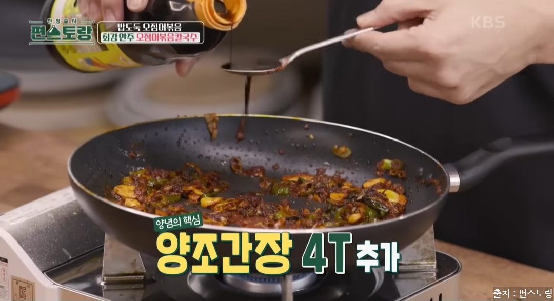 양조간장 4T를 넣고 강불로 올려 간장을 끓여줍니다. 간장을 끓여주면 음식의 풍미도 오르고 불향도 입습니다.