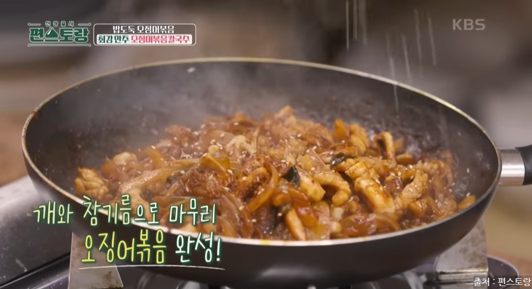 불을 끄고 깨와 참기름으로 마무리해주세요. 밥을 부르는 비주얼의 오징어볶음이 완성됩니다. 밥에 얹어먹어도 소면이랑 같이 먹어도 잘 어울릴 것 같아요. 요즘 식당에서 찾아보기 힘든 오징어 볶음 집에서도 맛있게 만들 수 있습니다.