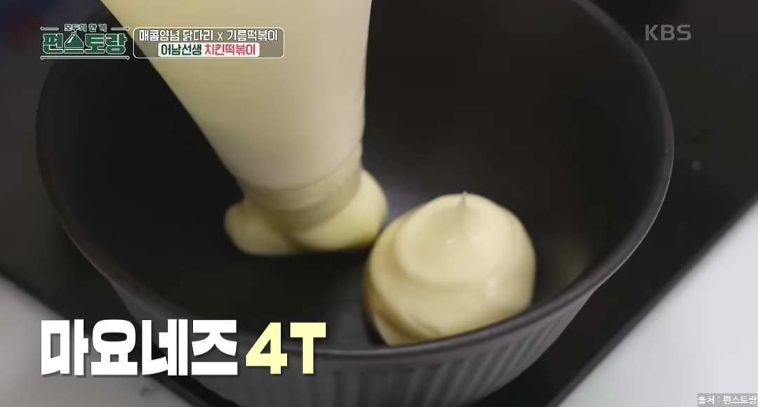 치킨떡볶이와 곁들일 특별소스인 연유마요소스를 만들어줍니다. 마요네즈 4T, 연유 2T, 꿀 1T를 넣고 섞으면 연유마요소스가 만들어집니다.
