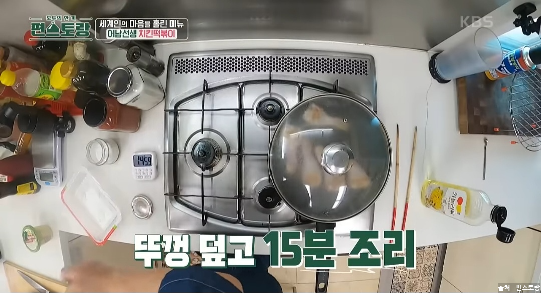 뚜껑을 덮고 15분간 조리해 주세요. 중간중간 타지 않게 뒤집어주셔야 합니다.
