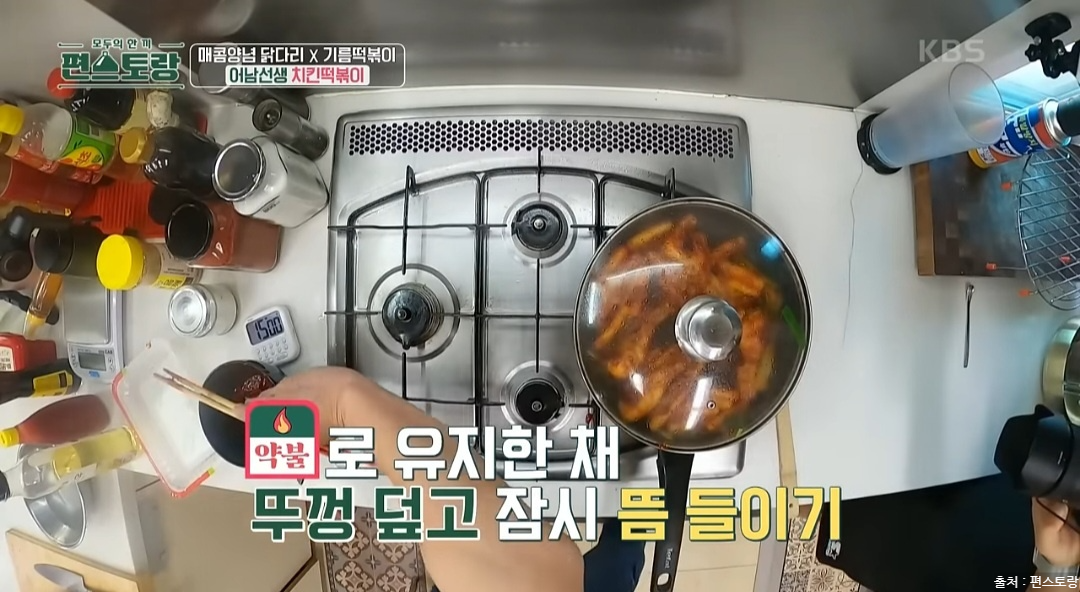 약불로 바꾸고 떡볶이 양념을 5T 넣고 계속 볶아줍니다. 볶아주다 약불로 유지한 채 뚜껑 덮고 잠시 1분만 뜸 들여주세요. 뜸을 들이면 안쪽까지 깊게 양념이 배어듭니다.