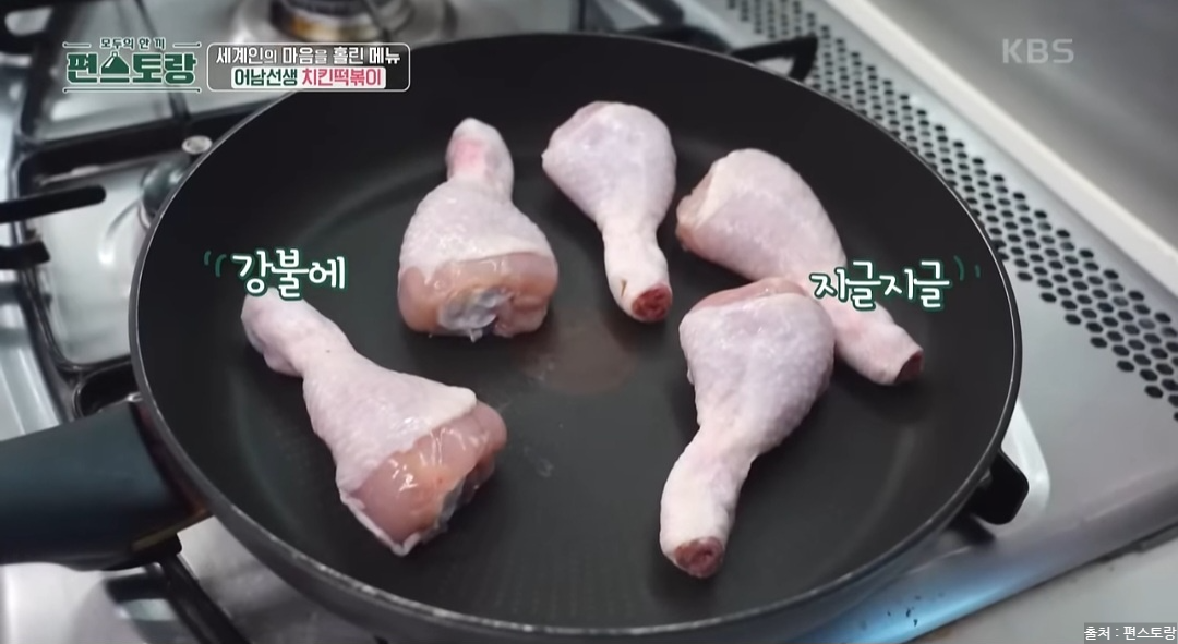 강불로 예열이 끝나면 기름 없이 예열된 팬에 닭다리를 투하해 주세요. 강불에서 충분히 노릇하게 구워줘야 마이야르 반응으로 맛있어집니다.