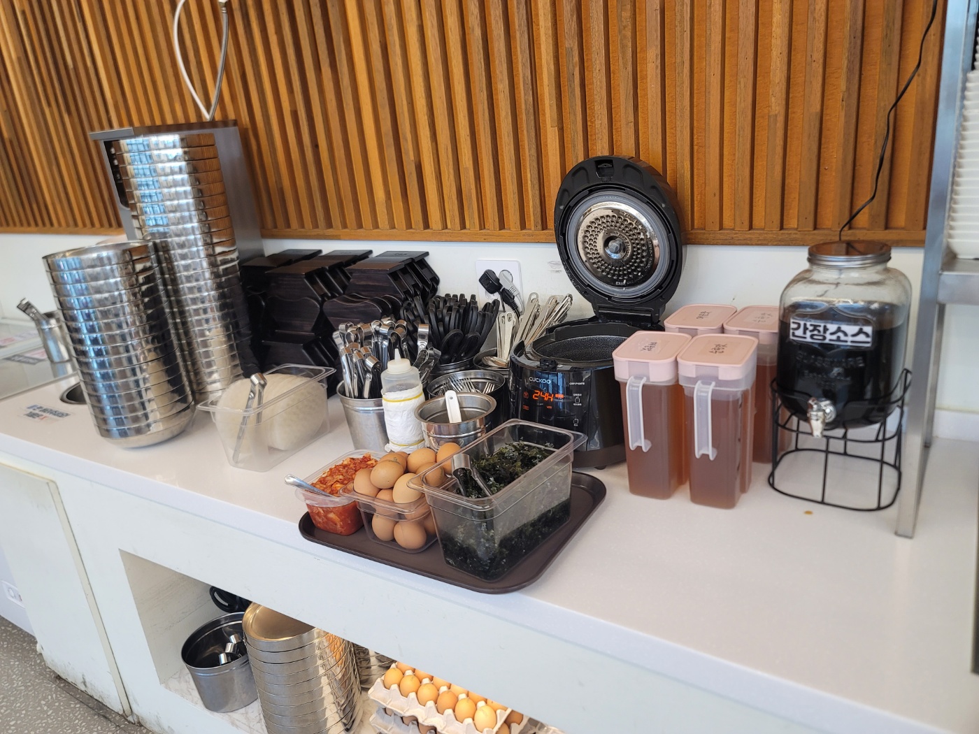 주문을 하고 주변을 둘러봅니다. 자리도 넉넉하고 가족손님을 위한 아기의자도 준비되어 있어요. 편백찜을 자리에 올려주시면 타이머를 설정해 주시는데 편백찜이 완성될 동안 셀프코너에 가서 다른 음식 세팅을 합니다.