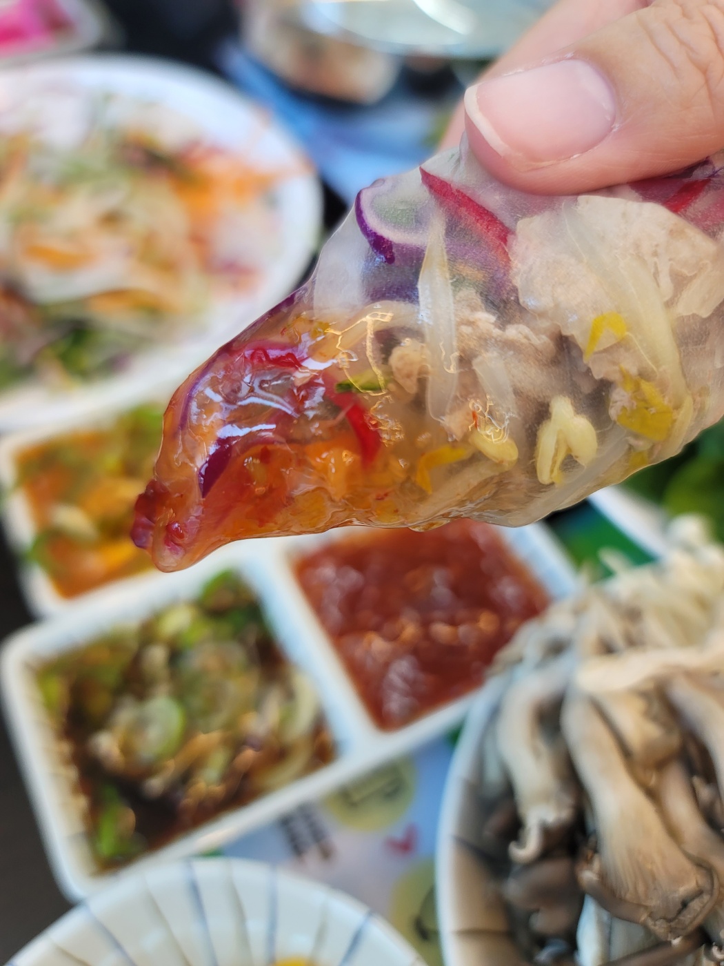 라이스페이퍼에 고기올리고 야채올리고 돌돌 말아서 소스에 콕 찍어서 먹으면 행복합니다.