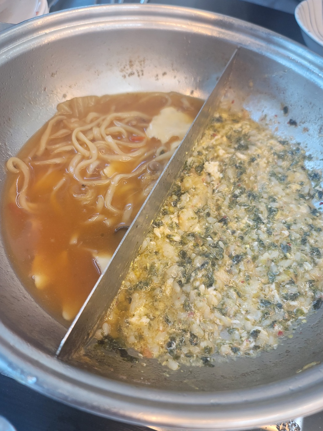 아직 끝나지 않았습니다. 매운 해물육수칸에는 칼국수, 수제비를 넣고 해물육수칸에는 죽을 만들어줍니다. 끝까지 완벽하네요.