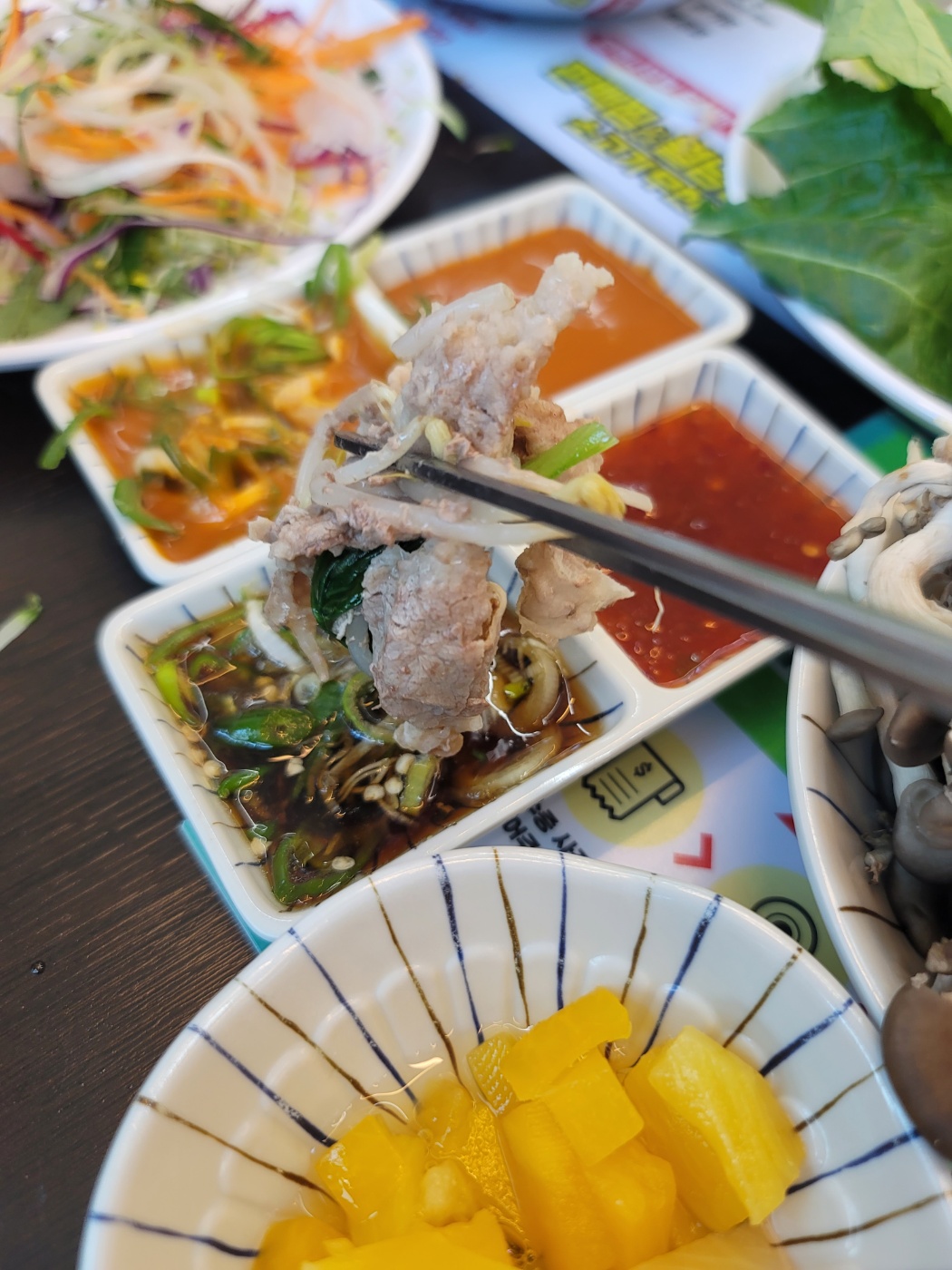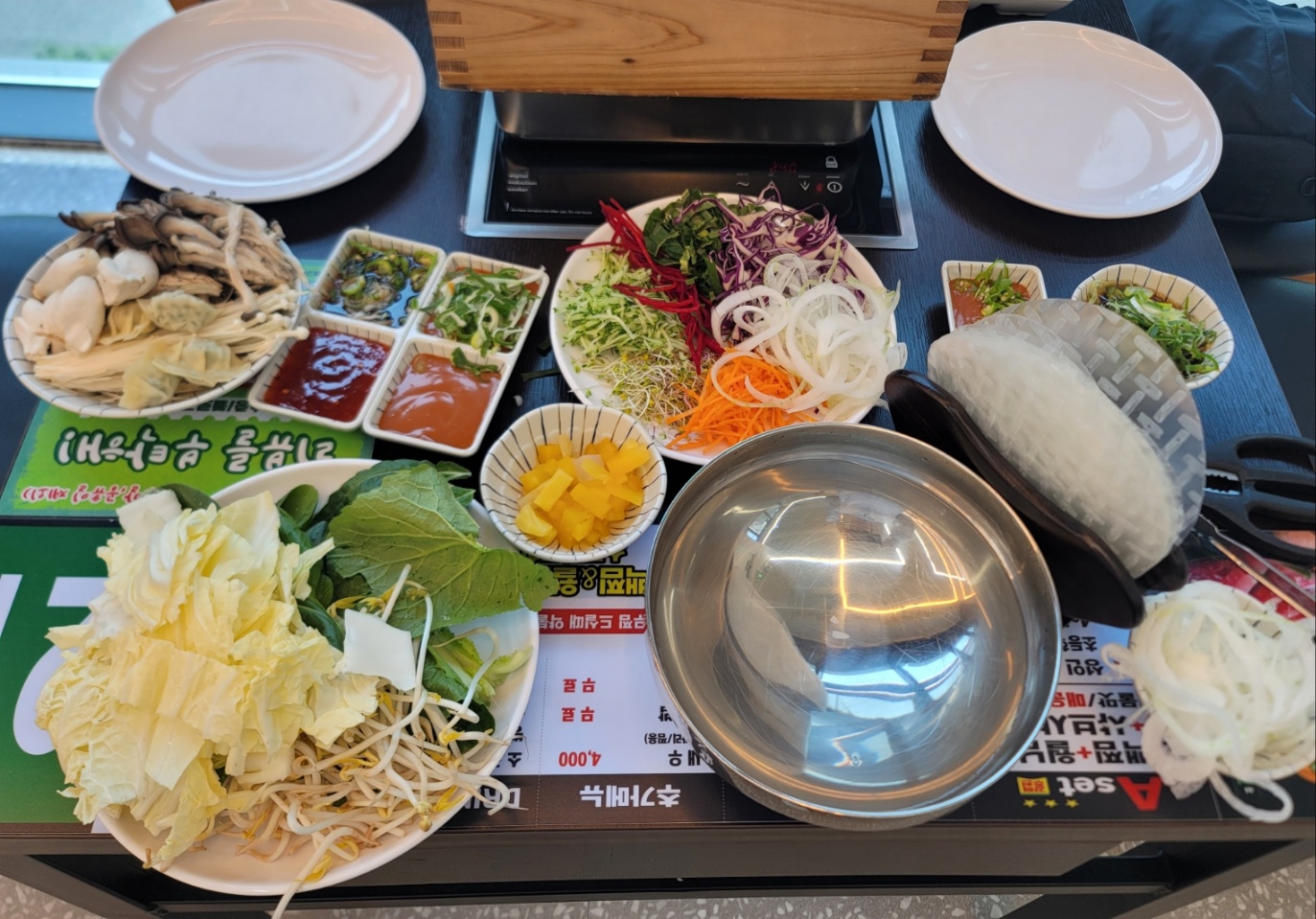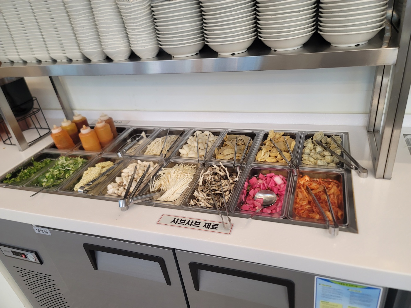 신선한 야채가 가득합니다. 샤부샤부용으로 청경채, 숙주나물, 배추, 얼갈이배추, 만두, 유부, 어묵, 버섯, 떡, 버섯류, 라면, 칼국수, 수제비가 있고 월남쌈용 야채로 당근, 오이, 비트, 깻잎, 양파, 새싹채소, 적양배추, 후르츠칵테일이 준비되어 있습니다. 소스는 간장소스, 칠리소스, 땅콩소스가 있는데 소스와 곁들일 수 있는 고추와 파도 있고 김치와 양파, 무장아찌도 있습니다. 리필용 육수와 죽을 만들 수 있는 밥, 김가루, 계란, 김치가 있고 월남쌈과 뜨거운 물, 뜨거운 물을 받을 수 있는 그릇도 있어요.