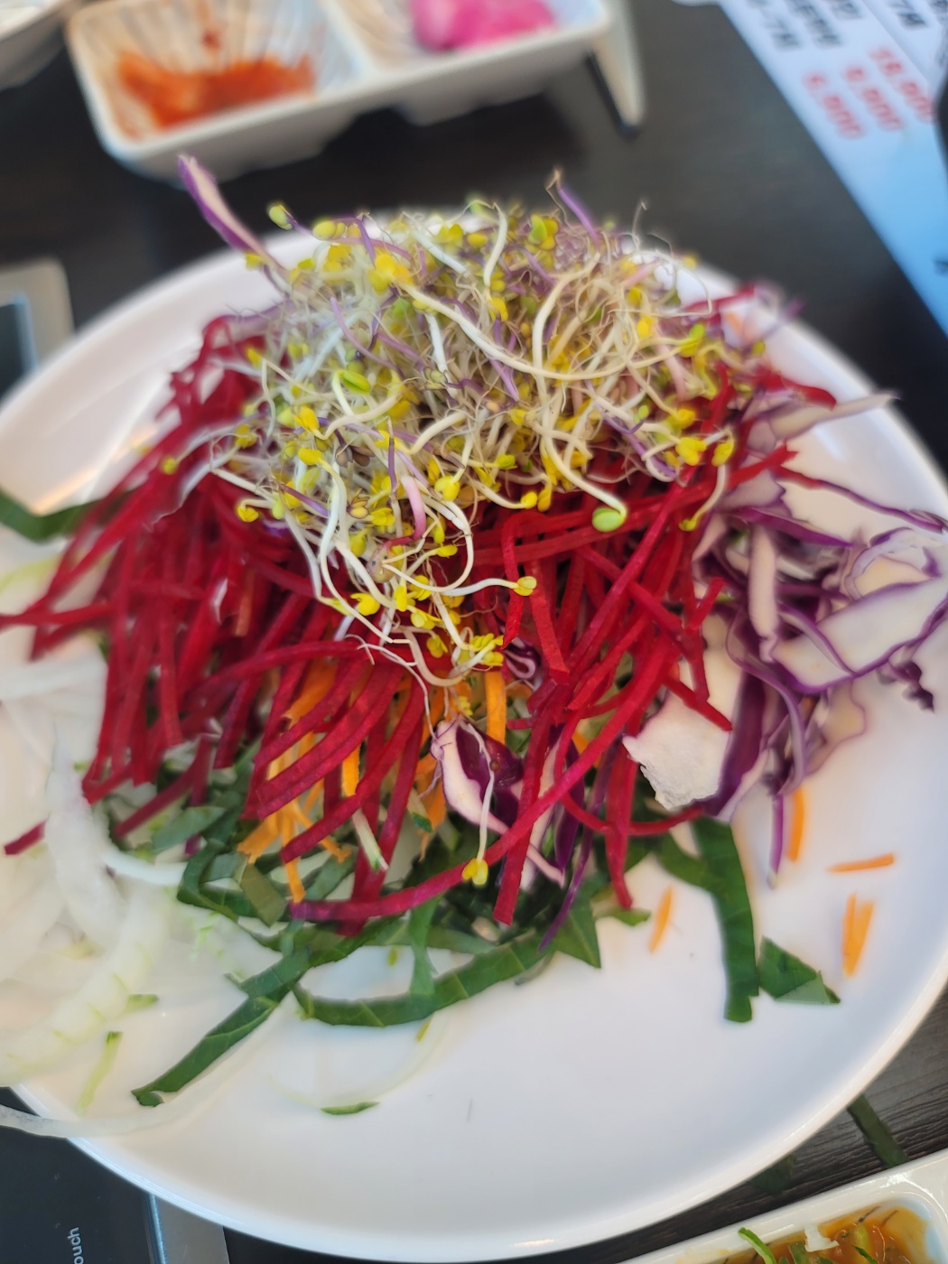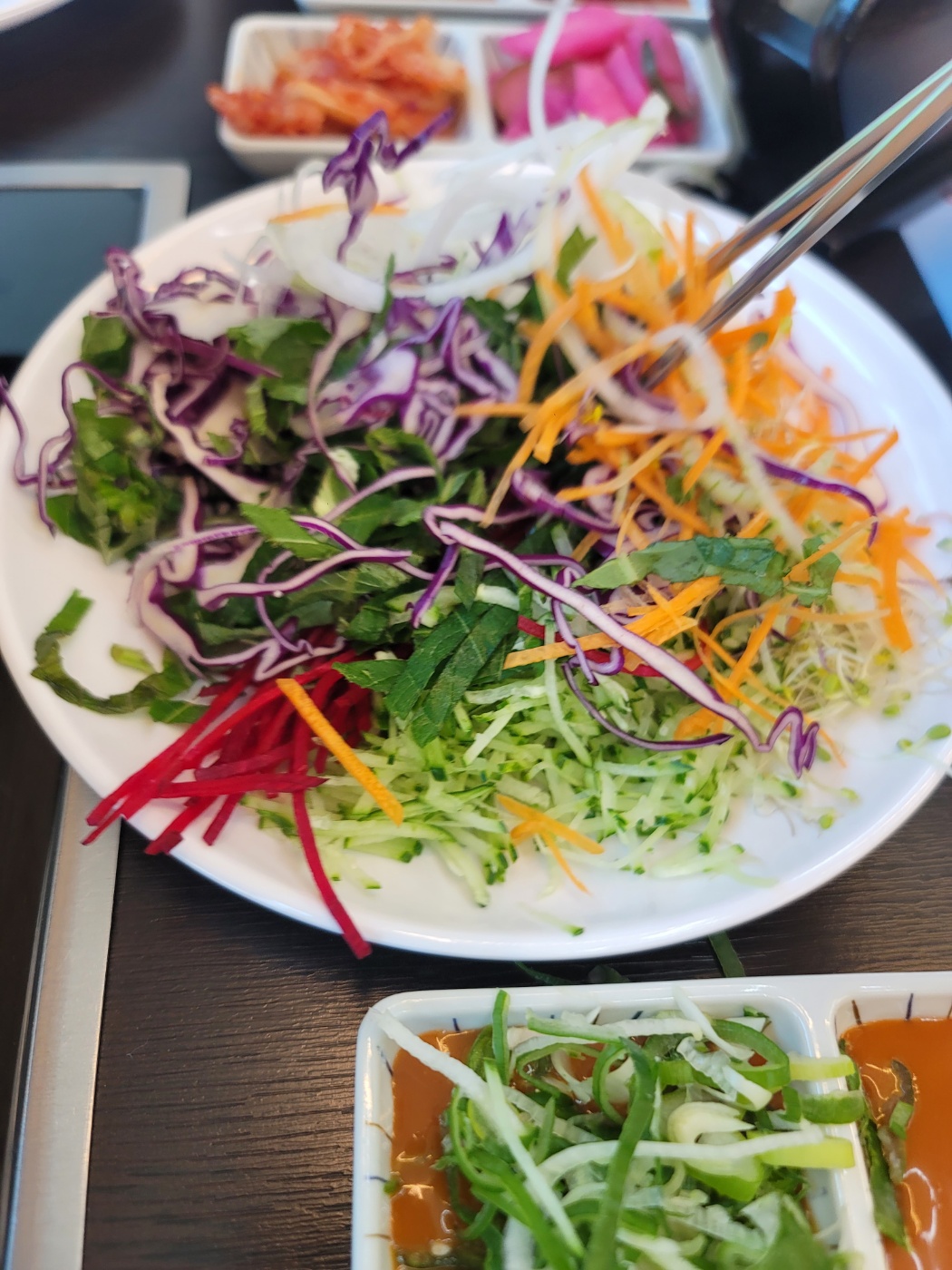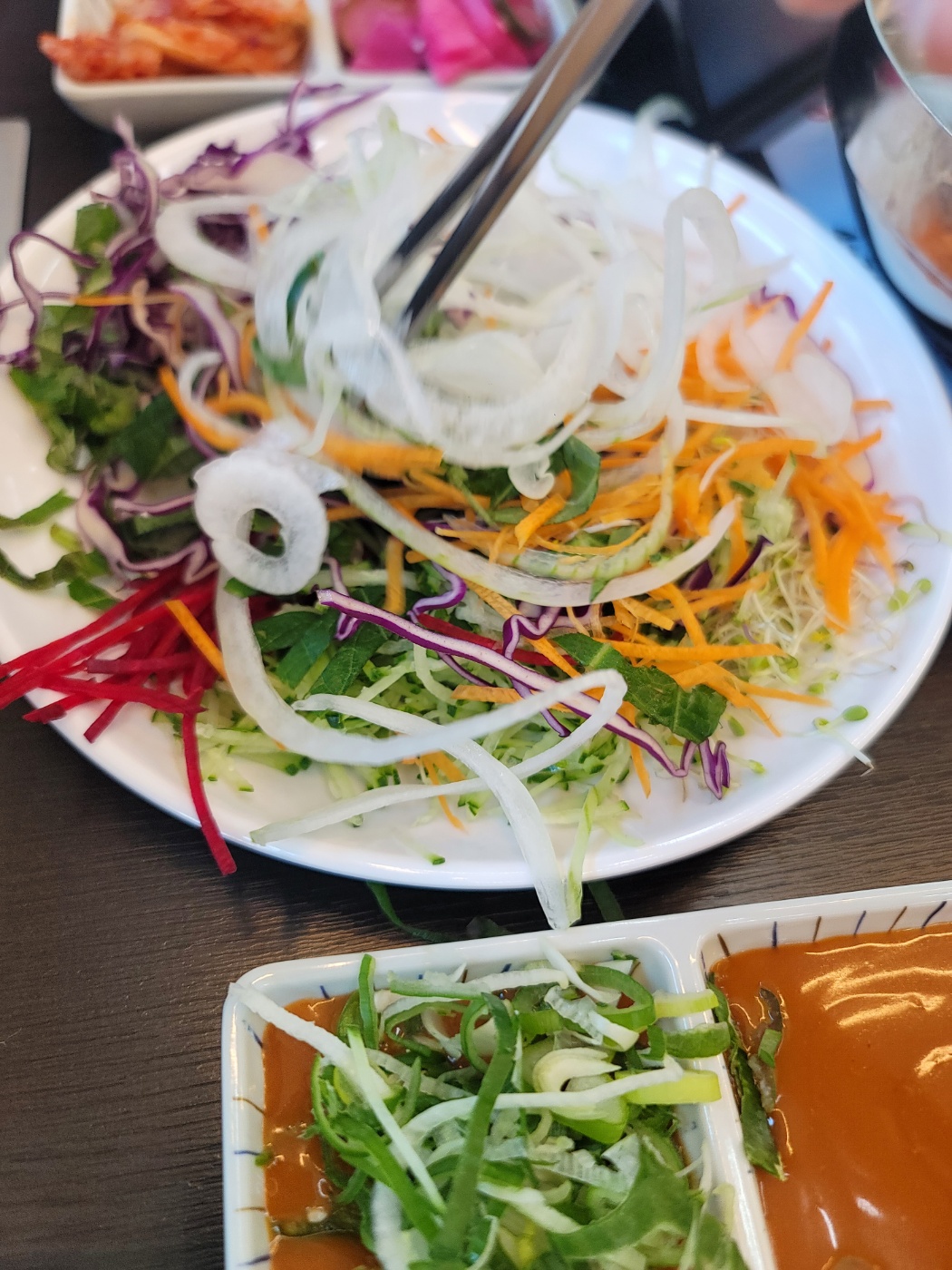 신선한 야채가 가득합니다. 샤부샤부용으로 청경채, 숙주나물, 배추, 얼갈이배추, 만두, 유부, 어묵, 버섯, 떡, 버섯류, 라면, 칼국수, 수제비가 있고 월남쌈용 야채로 당근, 오이, 비트, 깻잎, 양파, 새싹채소, 적양배추, 후르츠칵테일이 준비되어 있습니다. 소스는 간장소스, 칠리소스, 땅콩소스가 있는데 소스와 곁들일 수 있는 고추와 파도 있고 김치와 양파, 무장아찌도 있습니다. 리필용 육수와 죽을 만들 수 있는 밥, 김가루, 계란, 김치가 있고 월남쌈과 뜨거운 물, 뜨거운 물을 받을 수 있는 그릇도 있어요.