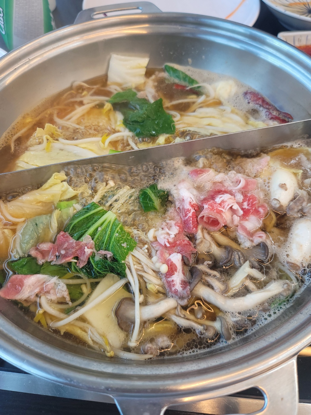 편백찜 한판을 휩쓸고 샤부샤부로 바꿨어요. 고추가 있는게 매운해물맛, 없는게 해물맛 입니다. 매운해물맛은 끝맛이 칼칼하니 시원하고 해물맛은 일반 샤브샤브 육수맛이랑 비슷합니다.