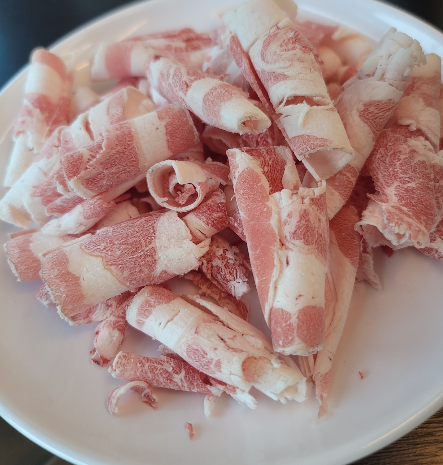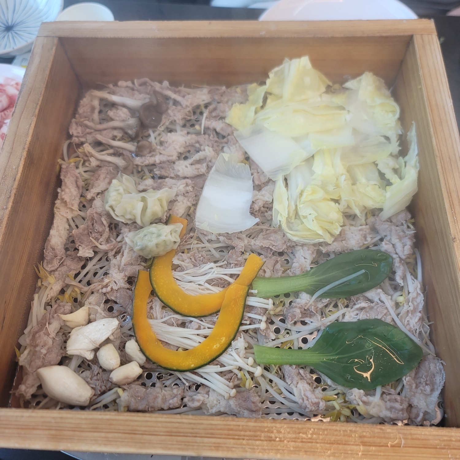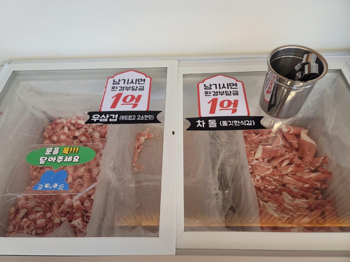 가장 중요한 소고기!! 소고기는 두 종류가 있는데요. 부드럽고 고소한 맛의 우삼겹과 쫄깃한 식감의 차돌이 있어요. 잔뜩 쌓인 고기를 보니 빨리 먹고 싶어 지네요.
