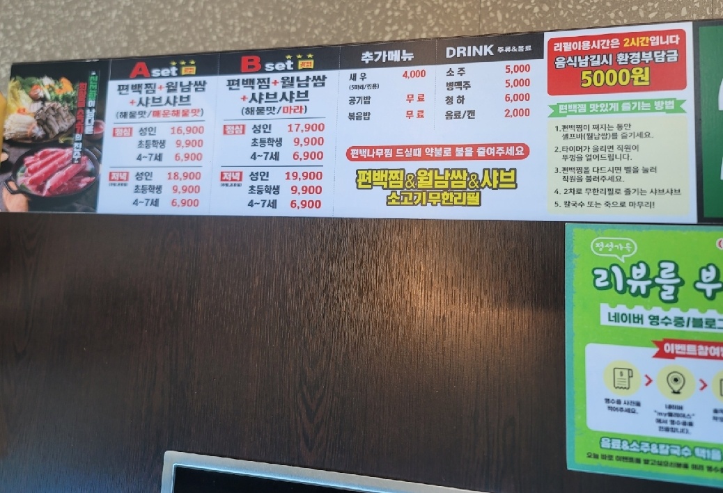 사람이 많을까 봐 오픈런을 했습니다. 편편집 수유점은 테이블오더로 주문을 받는데요. 못하시는 분들은 직원분께 얘기하면 주문해 주십니다. 메뉴는 샤부샤부육수 A세트(해물/매운 해물), B세트(해물/마라) 2가지 중 선택하시면 됩니다. 저는 A세트 해물맛과 매운 해물맛을 선택했어요. 리뷰이벤트도 하고 있으니 꼭 참여해 보세요.