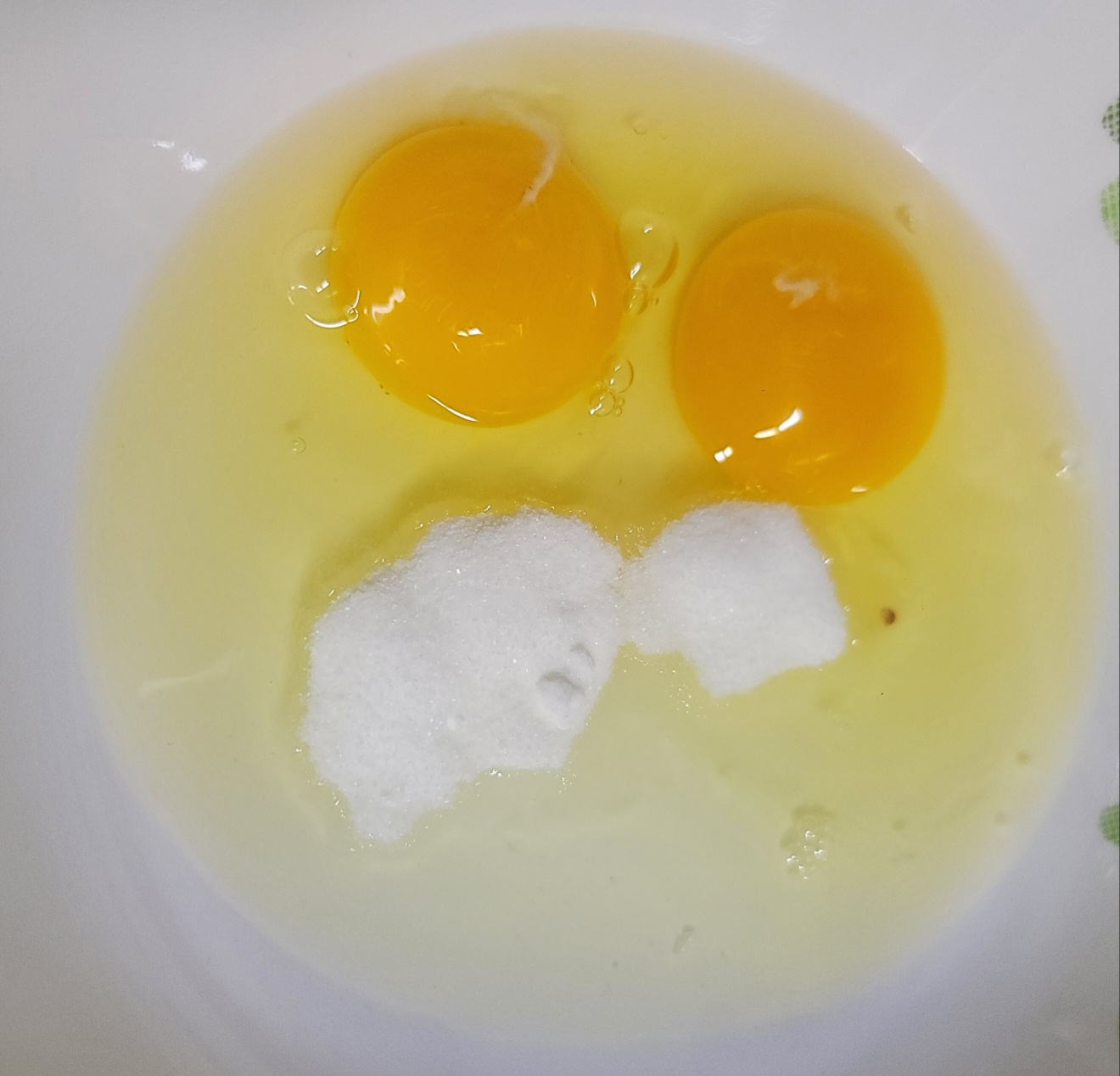 식빵 1장 = 계란 1개라고 생각하면 됩니다. 계란 2개와 설탕 1T, 소금 한 꼬집을 넣고 계란을 잘 풀어줍니다. 소금을 넣어줘야 더 맛이 있어요.